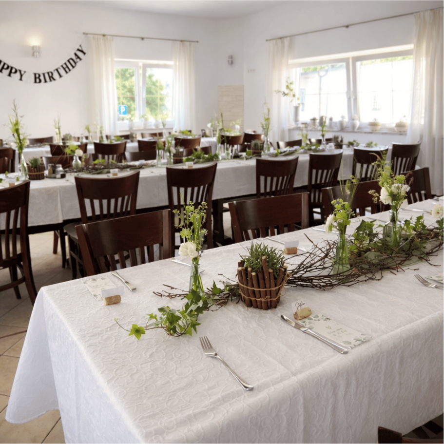 Das zweite Bild zeigt die liebevoll gestaltete Blumendekoration mit frischen Grünpflanzen, filigranen Zweigen und weißen Akzenten. Der helle Raum mit großen Fenstern sorgt für eine natürliche, ruhige Stimmung – ideal für familiäre Feiern, Taufen oder kleinere Events mit persönlichem Charakter.