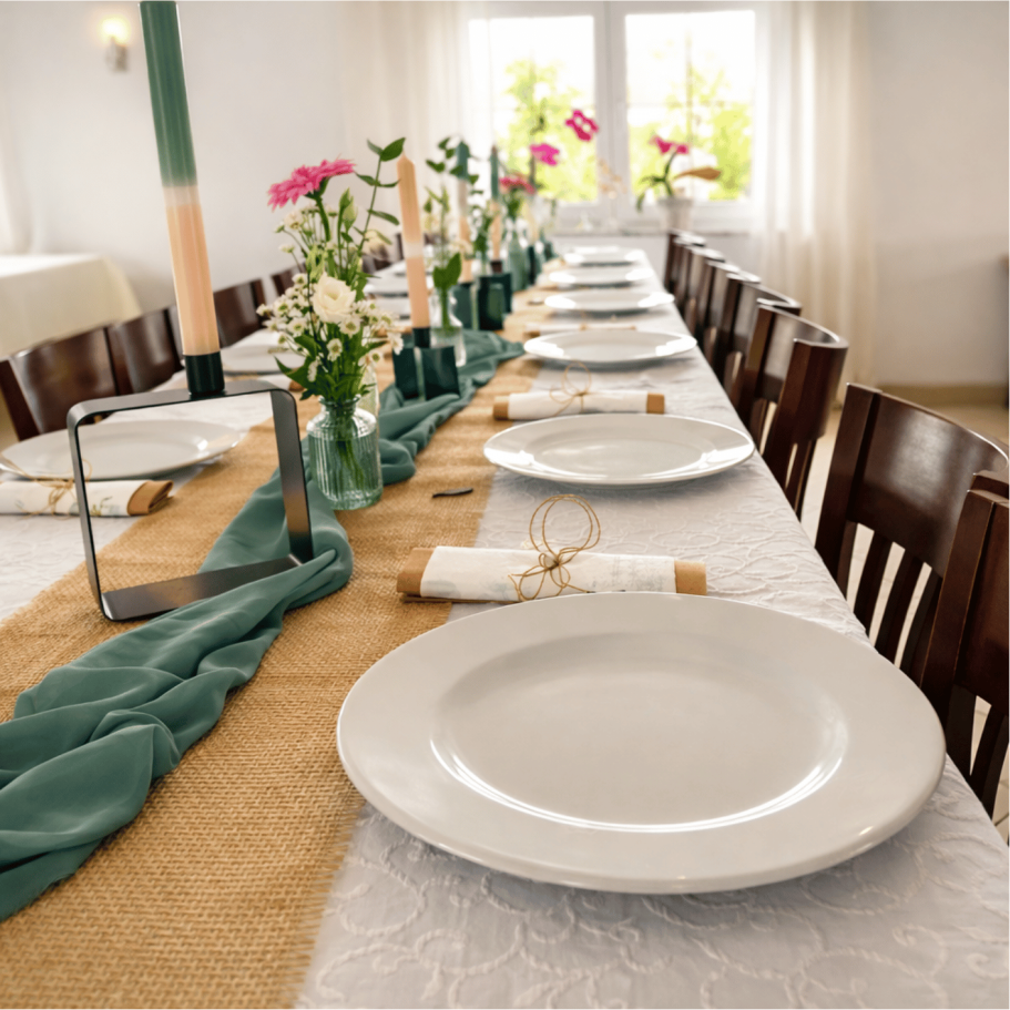 Hier präsentiert sich unser Veranstaltungsraum im modernen Stil: dezente Farben, plattere Aufteilung, elegante Kerzenhalter und geschmackvolle Platzierungen. Dieses Setup eignet sich perfekt für elegante Abendveranstaltungen, Firmenessen oder gehobene Feierlichkeiten in privatem Rahmen.