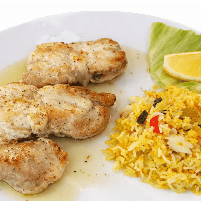 Zartes, schonend gebratenes Fleisch in aromatischer Zitronen-Öl-Sauce, dazu würziger Reis – leicht, frisch und voller Geschmack.