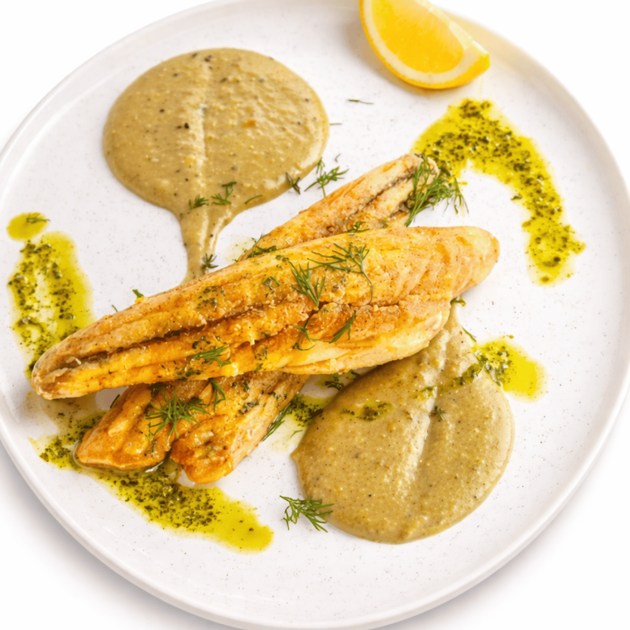 Knusprig gebratener Fisch auf cremigem Püree, verfeinert mit Kräuteröl – ein eleganter mediterraner Genuss.